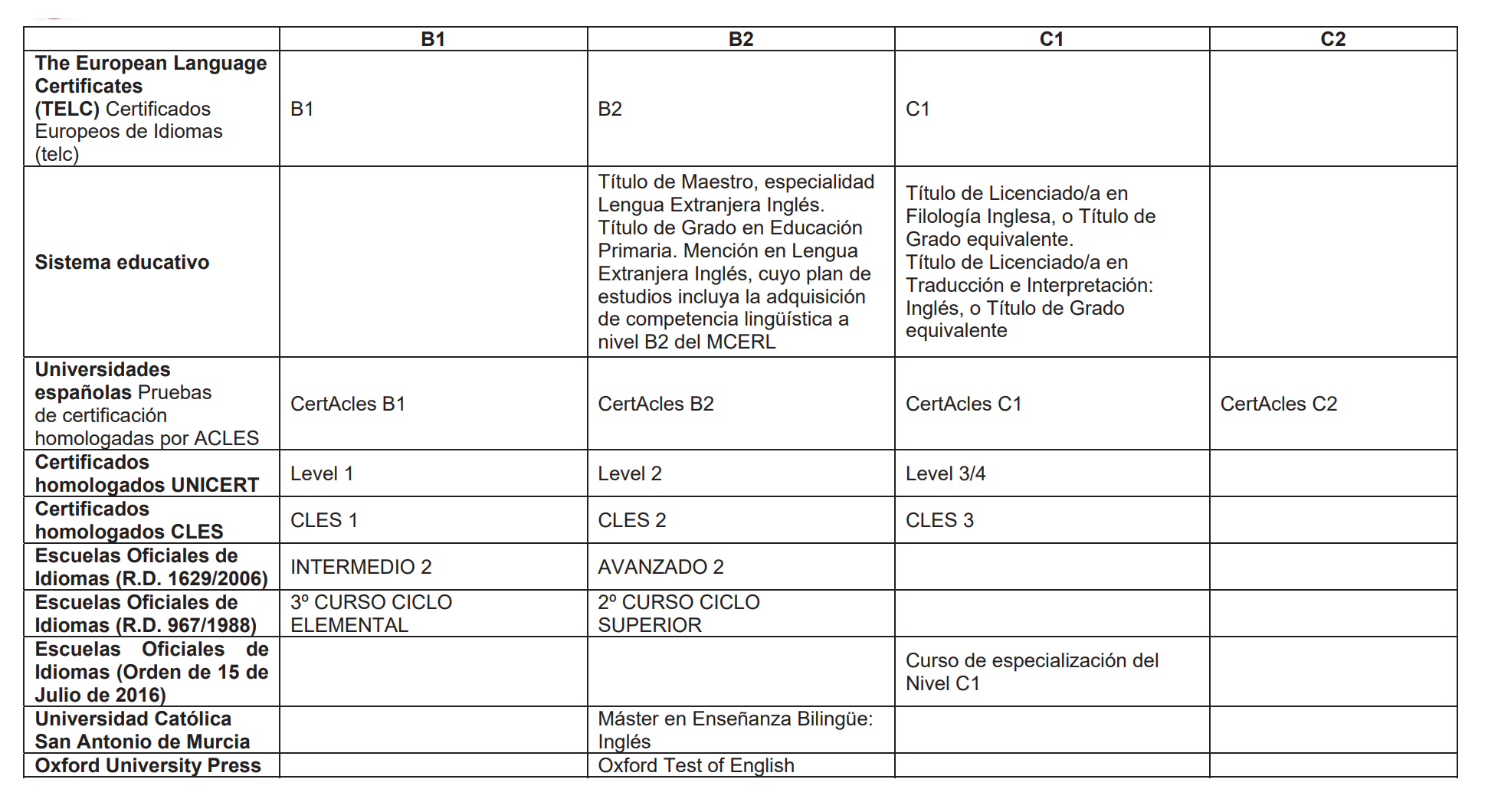 Puntos oposiciones profesorado Murcia, tabla de títulos de inglés válidos